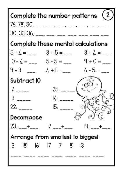 - 15 pages that could be used as workcards or worksheets including counting, mental addition and subtraction, adding and subtracting 10, decomposition, place value, number order