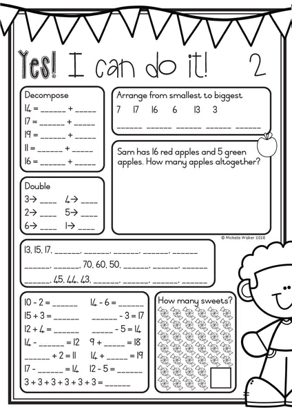 - 3 Yes! I can do it!: number order, before/after/between, word problems, money, decompose, doubling, counting, halving, repeated addition, mental addition and subtraction
