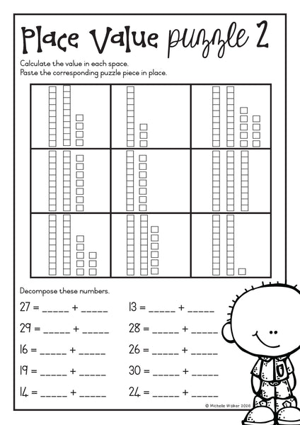 - 2 Place value puzzles : base ten place value of numbers 10-30, decompostition