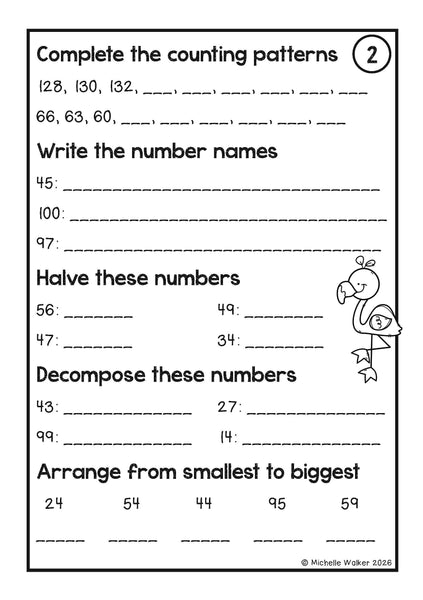 - 15 pages that could be used as workcards or worksheets including counting, number names, decomposition, doubling and halving, place value, number order